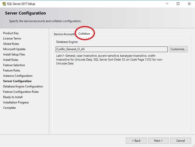 В том же окне, переходим во вкладку Collation.