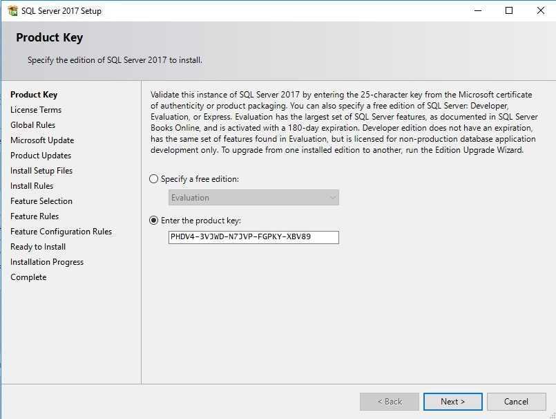При установке SQL Server 2017 сам предложит Вам пробный ключ, он аналогичен Evaluation — PHDV4-3VJWD-N7JVP-FGPKY-XBV89, для теста мы будем использовать его