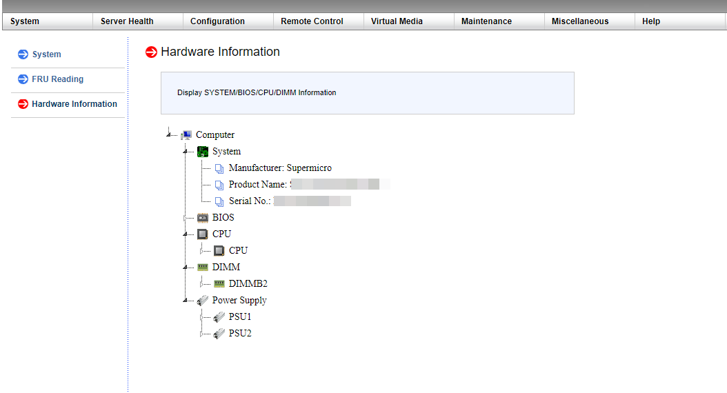 Через IPMI мониторить температуру и работу железа сервера SuperMicro довольно просто. Полная информация о железе сервера содержится в пункте System -> Hardware rmation.