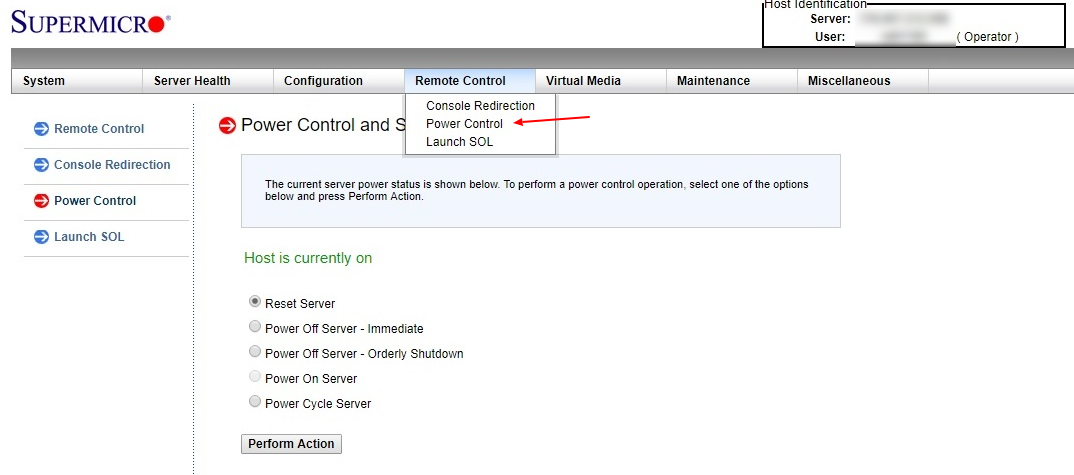 Управлять питанием сервера (включать, выключать, перезагружать сервер) можно через раздел Remote Control — Power Control.