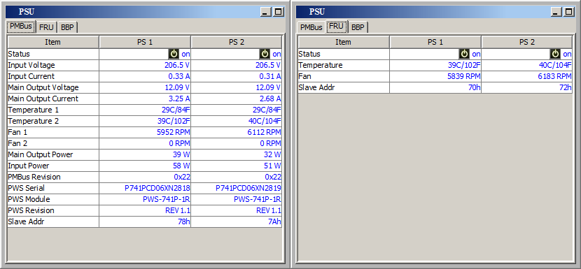 Item | Value —- | —— us | (00h) Input Voltage | 217.5 V Input Current | 1.06 A Main Output Voltage | 12.28 V Main Output Current | 17.93 A Temperature 1 | 23C/73F Temperature 2 | 21C/70F Fan 1 | 2064 RPM Fan 2 | 2032 RPM Main Output Power | 220 W Input Power | 228 W PMBus Revision | 0x22 PWS Serial Number | P2K4FCH02LT0125 PWS Module Number | PWS-2K04F-1R PWS Revision | REV1.0 Current Sharing Control | PEC error Item | Value —- | —— us | (00h) Input Voltage | 217.5 V Input Current | 1.09 A Main Output Voltage | 12.30 V Main Output Current | 18.09 A Temperature 1 | 24C/75F Temperature 2 | 22C/72F Fan 1 | 2064 RPM Fan 2 | 2064 RPM Main Output Power | 223 W Input Power | 234 W PMBus Revision | 0x22 PWS Serial Number | P2K4FCH02LT0126 PWS Module Number | PWS-2K04F-1R PWS Revision | REV1.0 Current Sharing Control | PEC error