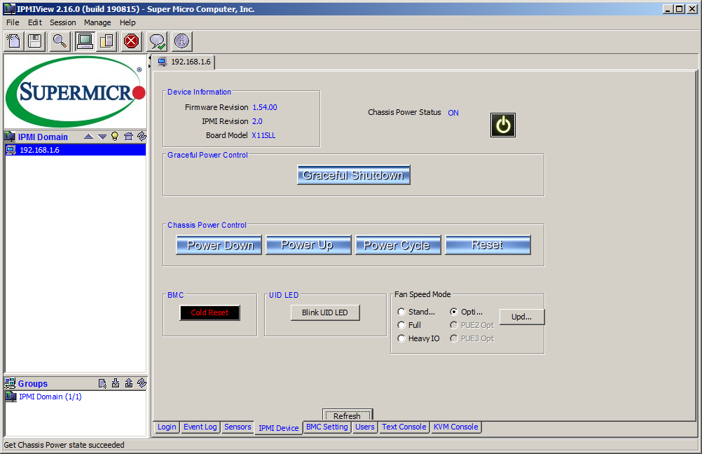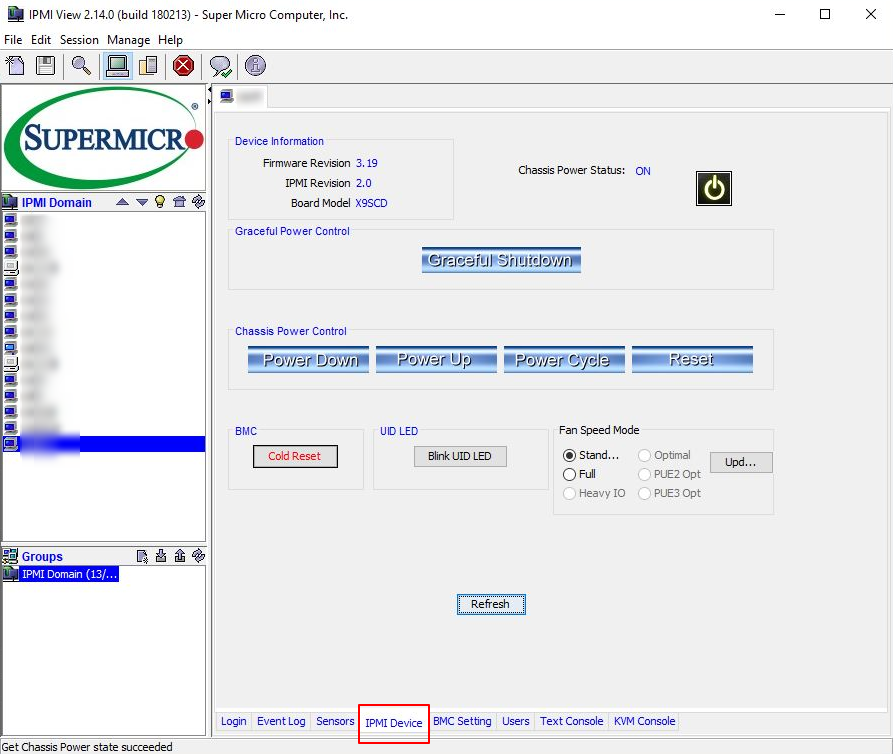 В IPMIView управление питанием располагается на вкладке IPMI Device: