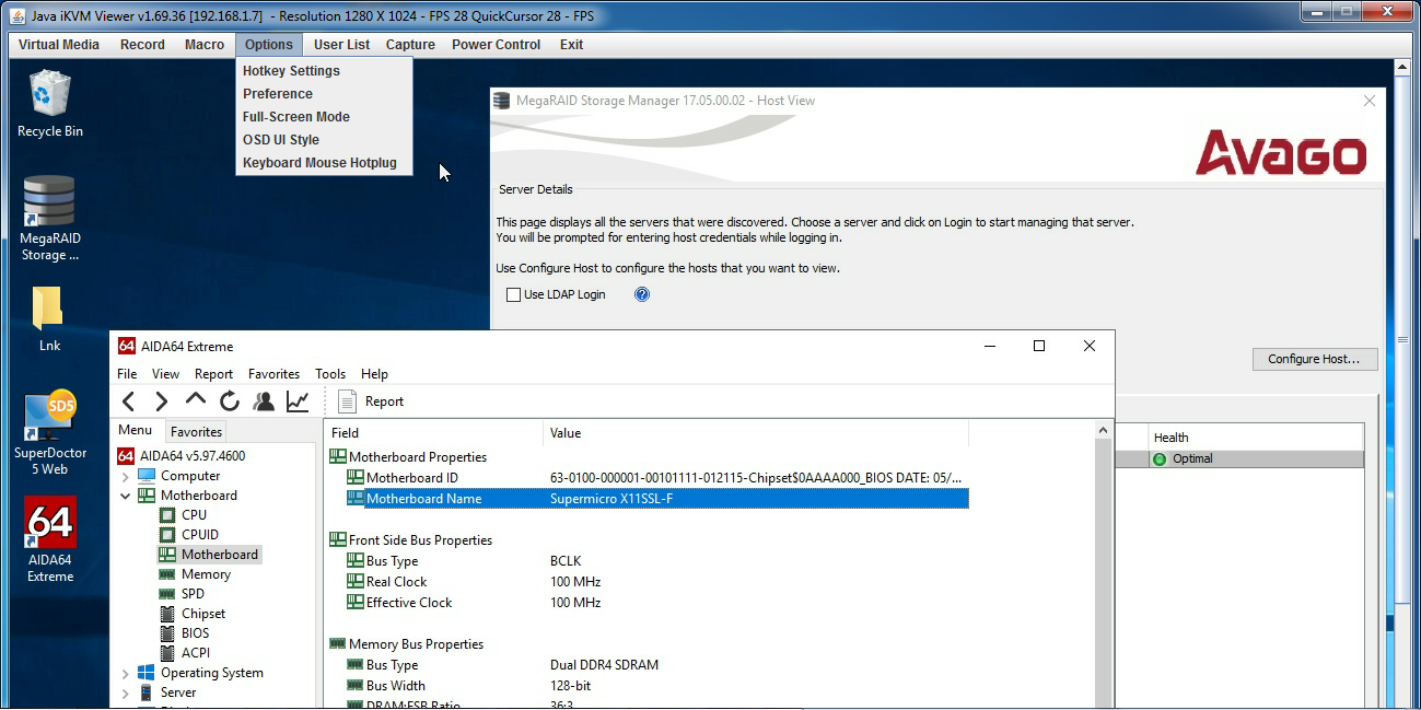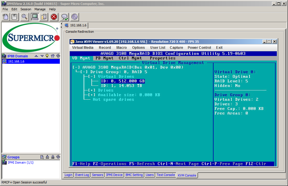 Прелесть управления по IPMI — в доступе к ресурсам удаленного сервера на этапе, предваряющем даже установки CMOS Setup системного UEFI BIOS. Мы специально оснастили тестовую платформу Supermicro X11SSL-F RAID-контроллером Avago 3108, чтобы продемонстрировать возможности по удаленной настройке его PCI BIOS.