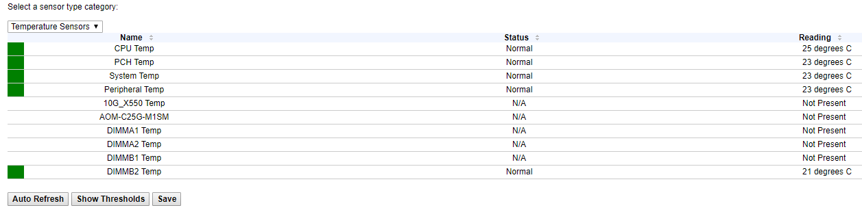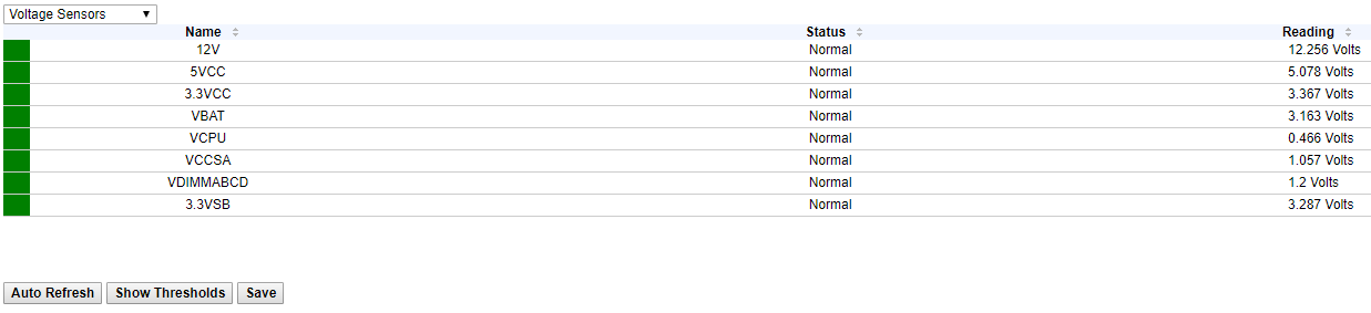Так как в данный момент на нашем сервере нет проблем, ни с температурой, ни с напряжением, все датчики находятся в зеленой зоне. Если на сервере поднимается температура или есть проблемы с напряжением, зеленые прямоугольники будут окрашиваться в красный цвет, что послужит сигналом для проверки вашего сервера.