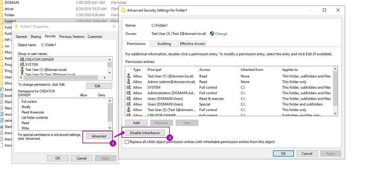 Наследование помогает установить разрешения для одной папки так, что оно будет применяться ко вложенным файлам и папкам. Если наследование отключить (2), то у нас будет возможность убрать все наследуемые разрешения или оставить их.