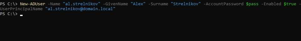 Обычно нам нужно создать учетку AD с паролем, именем и фамилией и она должна быть активна. Для создания пользователя AD с паролем используется другой командлет Powershell. Я объявлю пароль в переменной, но можно сразу и при создании пользователя:
