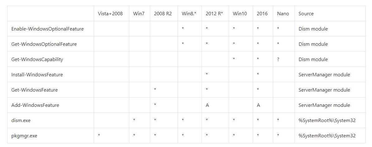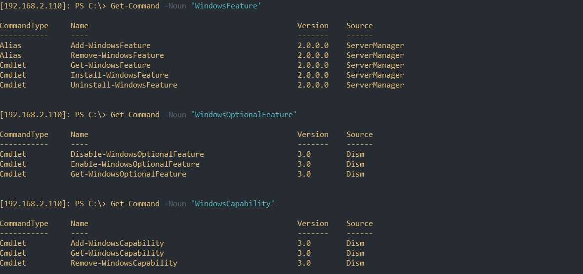 - WindowsFeature — относится к модулю ServerManager. Имеет возможности относящиеся только Windows Server и установке и удалению ролей и компонентов;