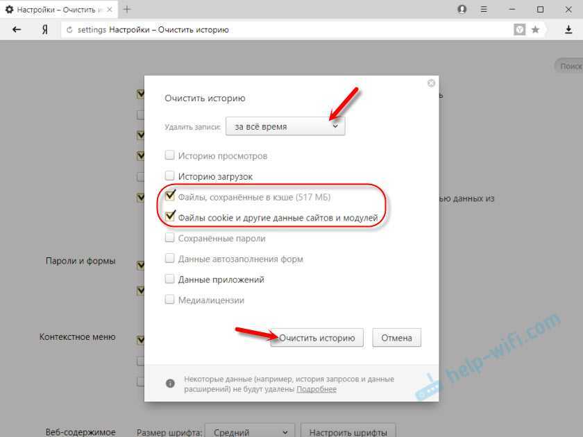 Выбираем «За все время» и выделяем галочками два пункта: «Файлы, сохраненные в кэше» и «Файлы cookie…».