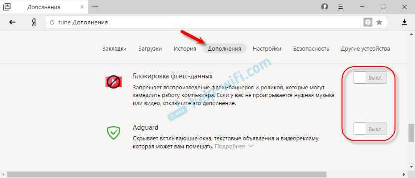 Дальше можно попробовать отключить все дополнения. В меню откройте настройки и перейдите на вкладку «Дополнения». Отключите все сторонние дополнения.