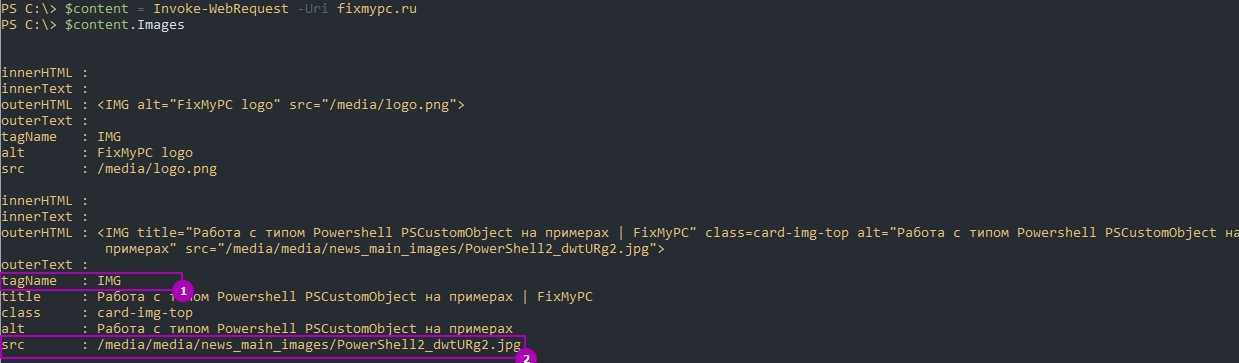 То есть все картинки имеют тег IMG и SRC. В Powershell часть тегов уже собрана в отдельные свойства и так мы получим список всех картинок: