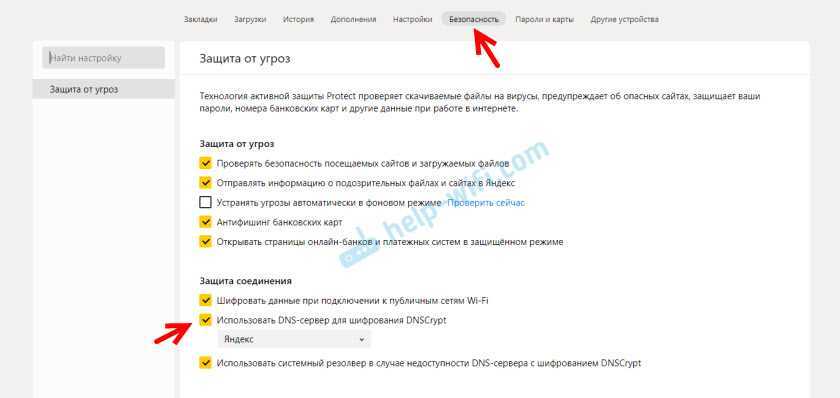 В настройках Яндекс Браузера, в разделе «Безопасность» – «Защита от угроз» – «Защита соединения» нужно поставить галочку возле «Использовать DNS-сервер для шифрования DNSCrypt».