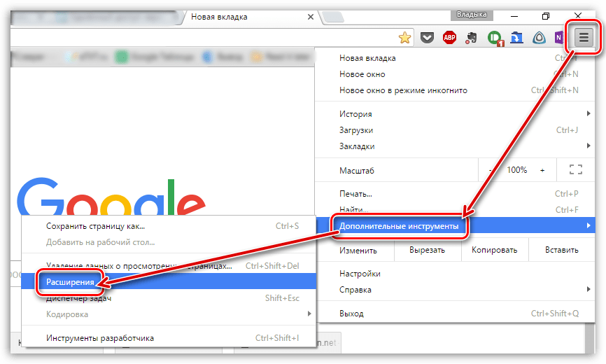 Щелкните в верхнем правом углу по кнопке меню веб-обозревателя и в отобразившемся списке перейдите к пункту «Дополнительные инструменты» – «Расширения».