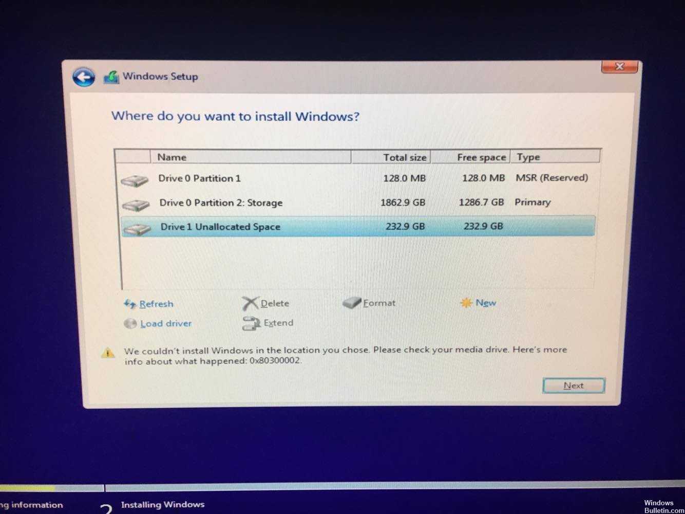 0x80300002 — это Ошибка установки Windows, Это означает, что существует некоторая форма повреждения в таблице разделов или разделах и что вам не разрешено устанавливать выбранный раздел.