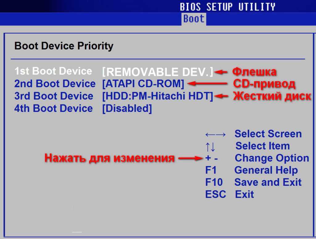 - Установите USB-накопитель / съемные устройства в качестве «Первого загрузочного устройства».