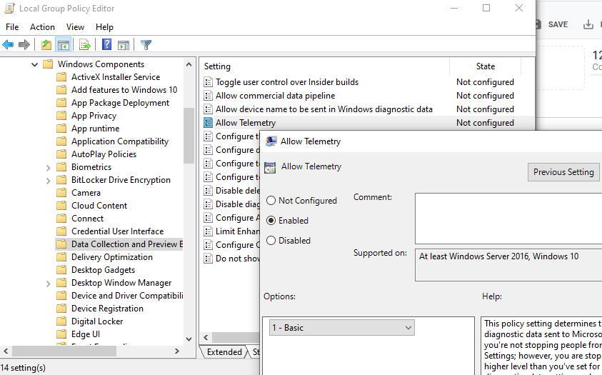 Найдите и включите политику Allow Telemetry = Enabled. Установите один из следующих режимов: 1 (Basic), 2 (Enhanced) или 3 (Full).
