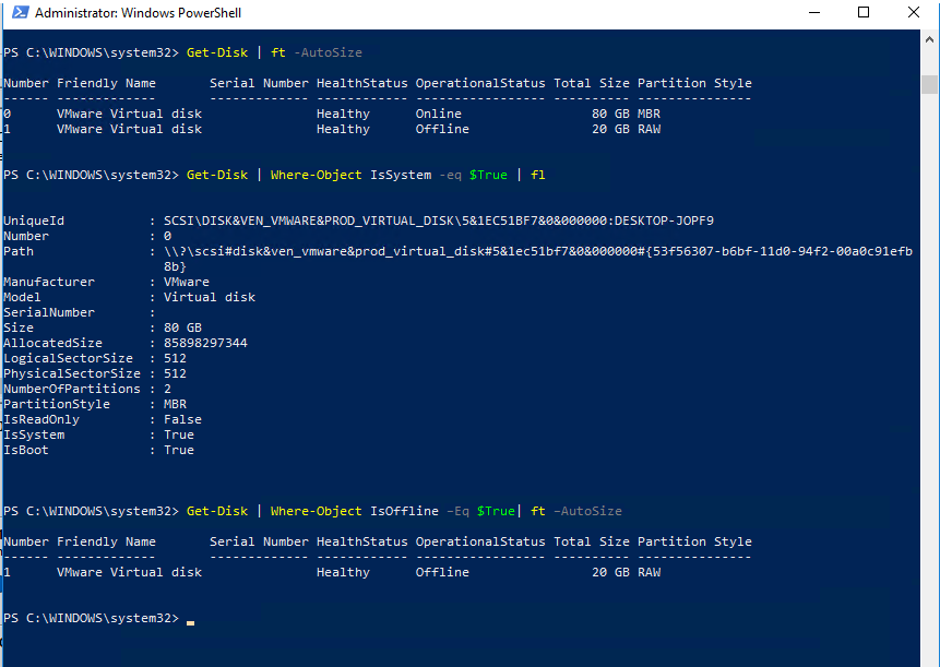 UniqueId : SCSIDISK&VEN_VMWARE&PROD_VIRTUAL_DISK5&1EC51BF7&0&000000:DESKTOP-JOPF9Number : 0Path : \?scsi#disk&ven_vmware&prod_virtual_disk#5&1ec51bf7&0&000000#<53f56307-b6bf-11d0-94f2-001efb8b>Manufacturer : VMwareModel : Virtual diskSerialNumber :Size : 80 GBAllocatedSize : 85898297344LogicalSectorSize : 512PhysicalSectorSize : 512NumberOfPartitions : 2PartitionStyle : MBRIsReadOnly : FalseIsSystem : TrueIsBoot : True