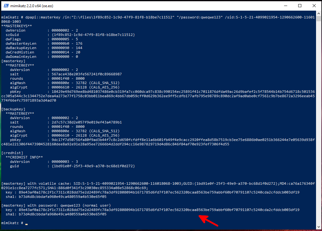 dpapi::masterkey /in:"Z:\files\1f89c852-1c9d-47f9-81f8-b18be7c11512" "/password:qweqwe123" /sid:S-1-5-21-4099021954-1290662600-116018068-1003