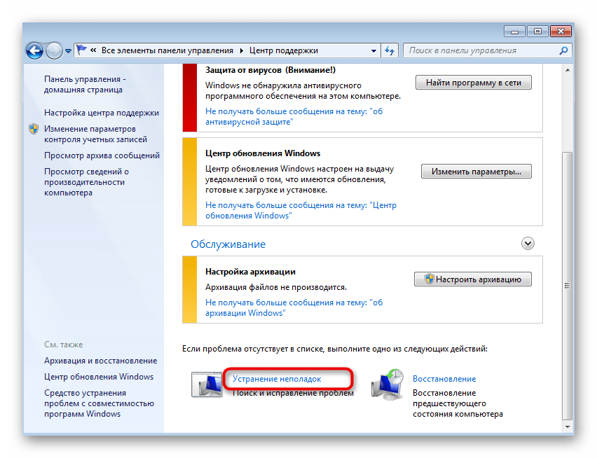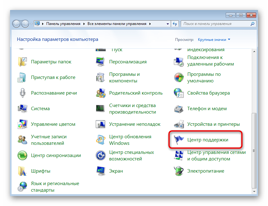 - В приложении «Панель управления» перейдите к разделу «Центр поддержки».