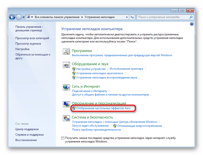 Рассмотрим вариант, который необходимо выполнить в тех ситуациях, когда при попытке изменить параметры персонализации появляется ошибка или на экране вообще ничего не меняется. Часто проблемой выступают отключенные службы Aero, но могут быть и другие причины. Проще всего — использовать средство устранения неполадок, которое автоматически найдет и исправит ошибки, связанные с оформлением.
