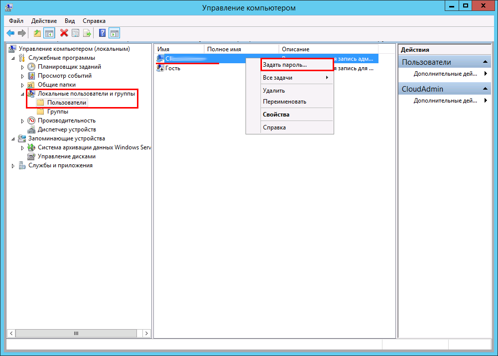 В левой части открывшегося окна раскрываем ветку “Локальные пользователи и группы” и открываем папку Пользователи. В основной части окна, кликаем правой кнопкой мыши по пользователю и в контекстном меню выбираем “Задать пароль…”.