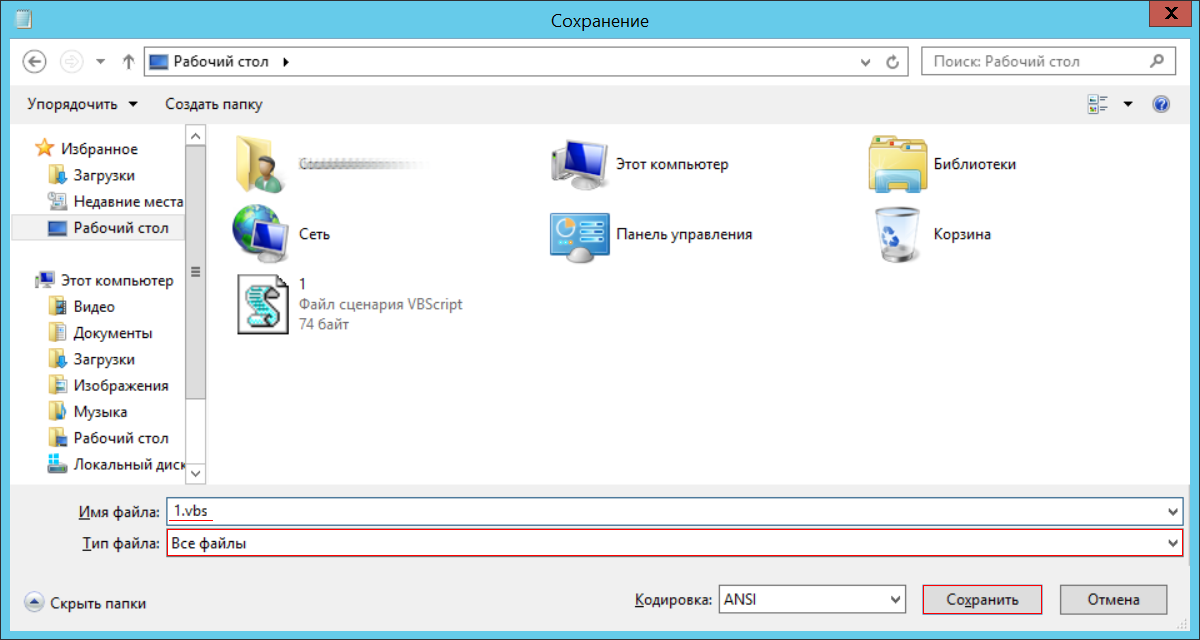 В новом окне выбираем директорию для сохранения файла, например, Рабочий стол. В Тип файла выбираем Все файлы, а в Имя файла указываем произвольное имя, например, 1.vbs.