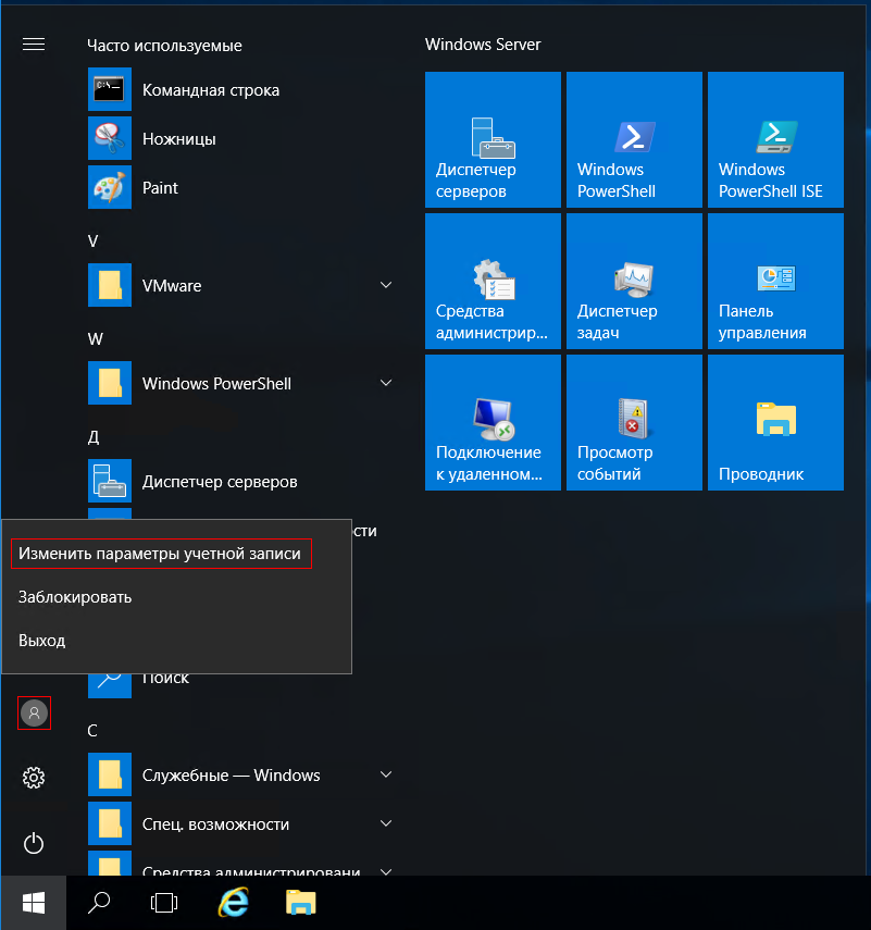 Открываем меню Пуск и кликаем по значку пользователя, в открывшемся меню выбираем “Изменить параметры учетной записи”.
