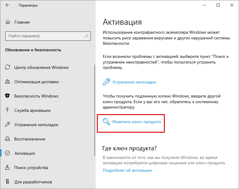 - Переходим в «Пуск» — «Параметры» — «Обновление и безопасность» — «Активация» — «Изменить ключ продукта». Для установки Windows 10 Enerprise также понадобится ключ активации продукта