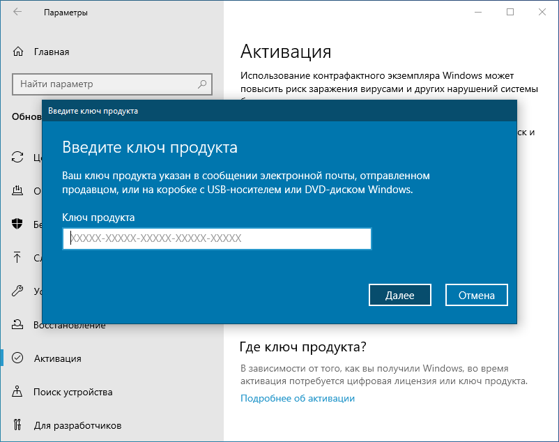 - После вводим ключ в диалоговом окне. Вводим ключ продукта