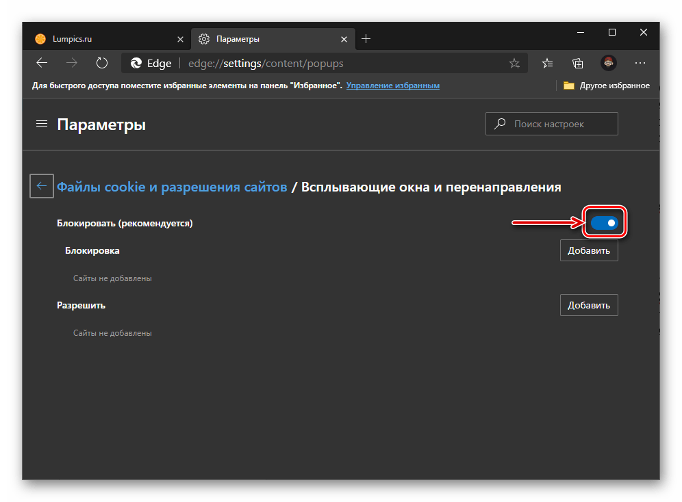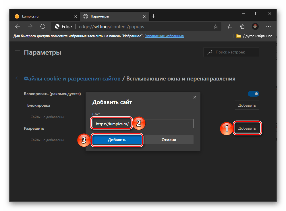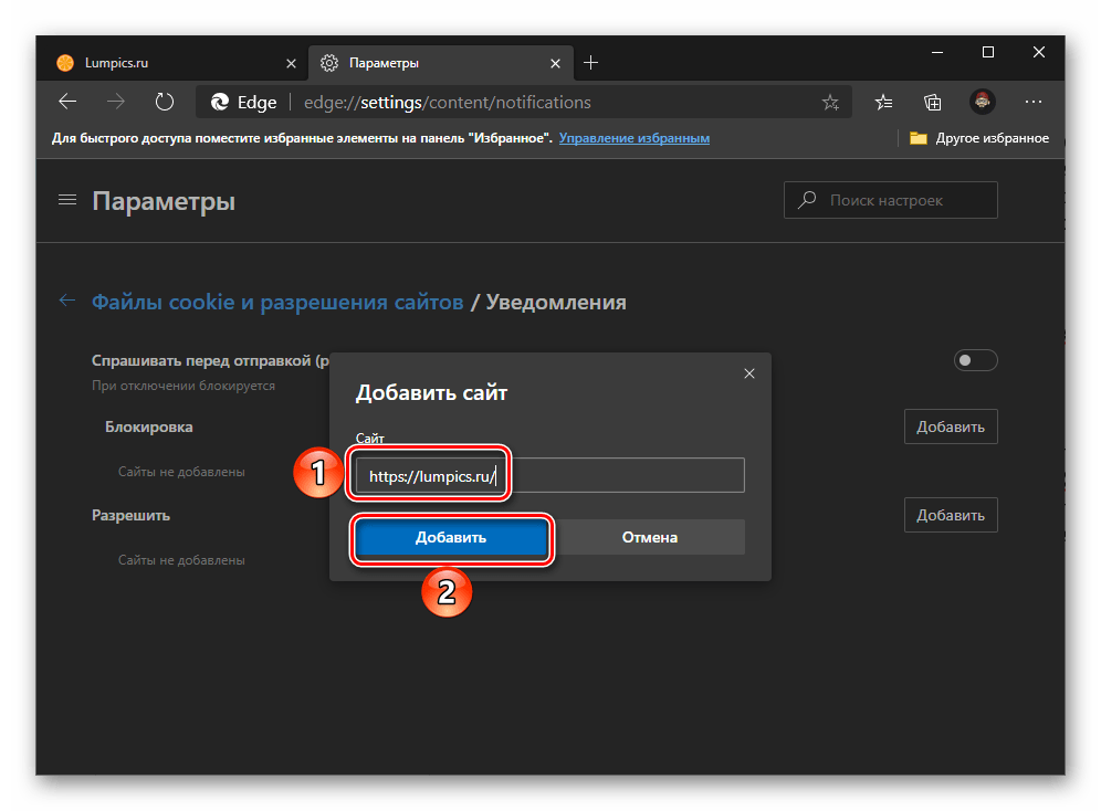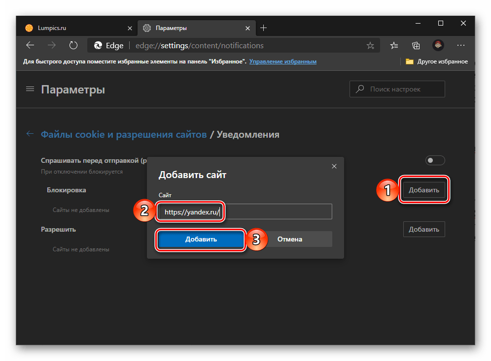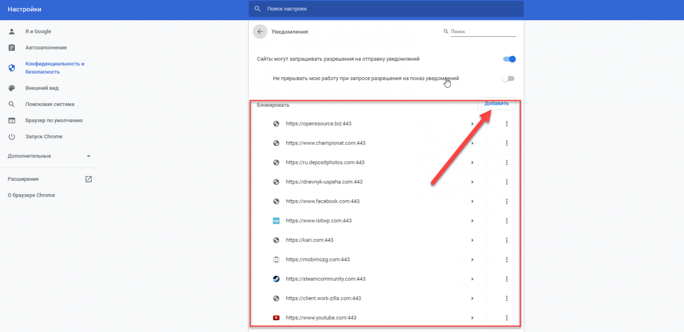 - После проделанной процедуры, показ уведомлений в Опере будет отключен на всех сайтах, но можно также настроить блокировку запроса всплывающих Push-уведомлений для отдельных сайтов. Для этого достаточно нажать кнопку «Добавить» напротив «Блокировать» — если нужно избавиться от уведомлений на каком-то конкретном сайте, либо нажать «Добавить» напротив «Разрешить» — для того, чтобы исключить сайт из общей блокировки. После чего вписать URL сайта.