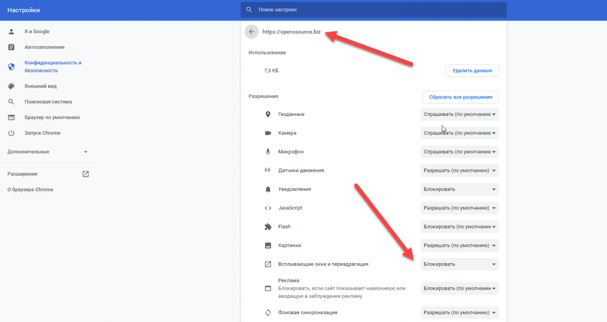 Попадаете в раздел, где будут детально настраиваться все разрешения для площадки. Здесь находите вкладку Всплывающие окна и переадресация, выбираете рядом с ней Блокировать