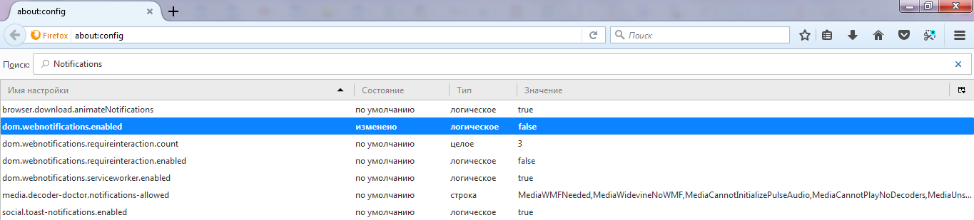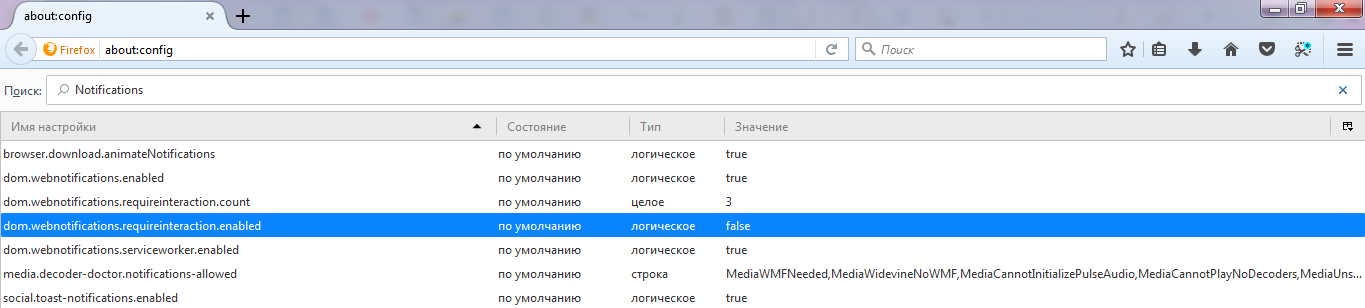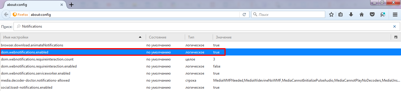 Рисунок 3. Найдите значение dom.webnotifications.enabled.