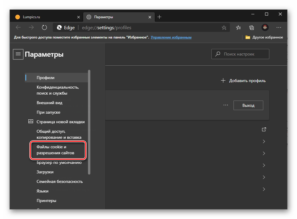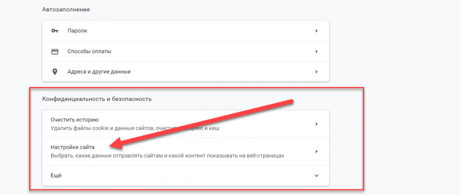 Найдите вкладку Конфиденциальность и безопасность, кликните Настройки сайта