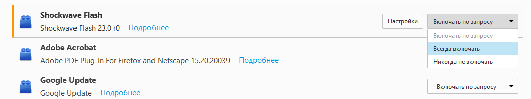 2. Далее находим пункт «Shockwave Flash» и выберите пункт «Всегда включать». Таким образом Flash Player будет включаться автоматически.