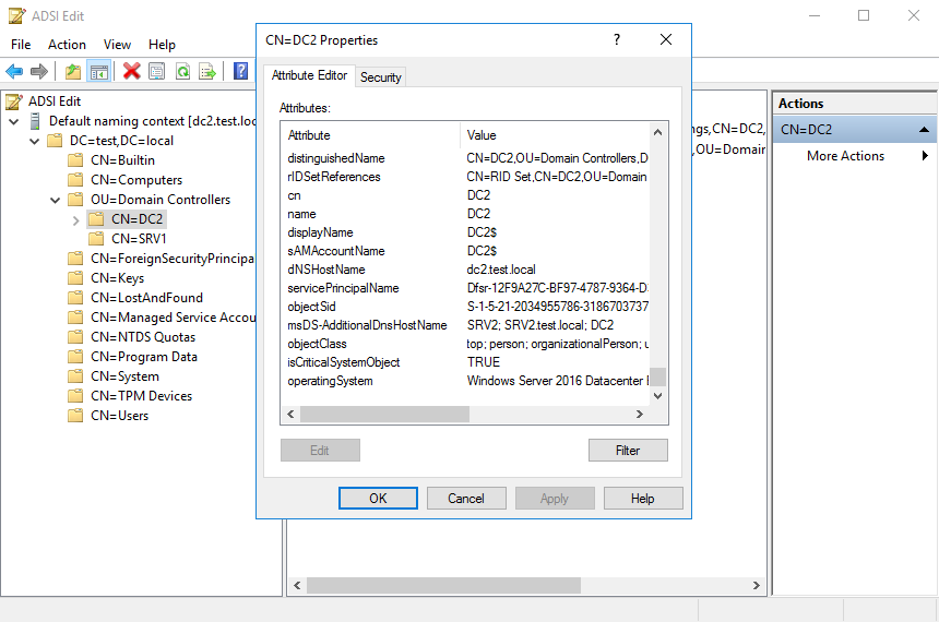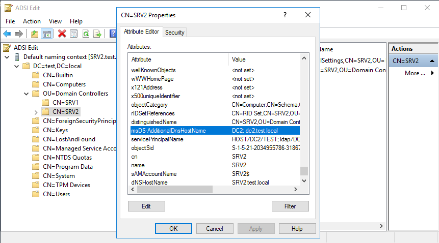 После перезагрузки произойдет смена имени. Для проверки откроем ADSIEdit и убедимся в том, что имя DC2 стало основным, а SRV2 — дополнительным.