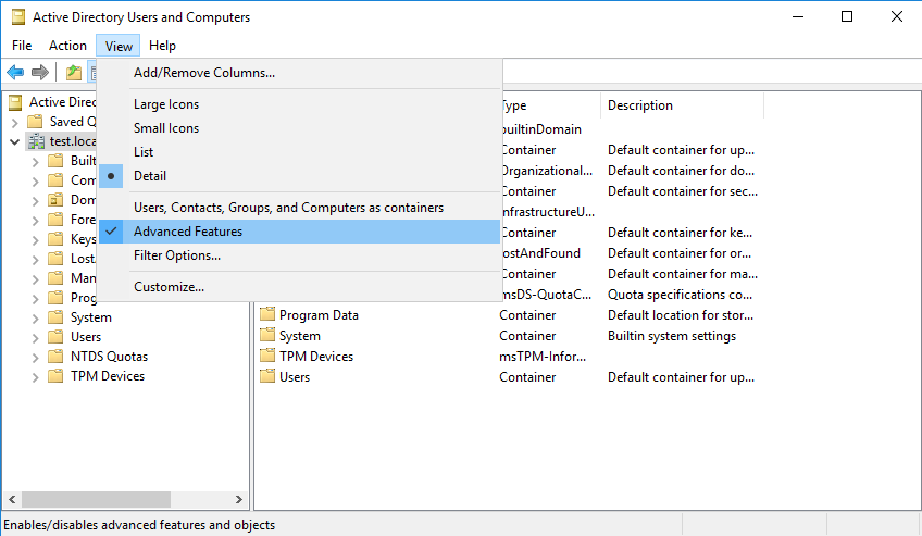 Для этого открываем оснастку Active Directory Users and Computers и в меню View отмечаем пункт Advanced Features.