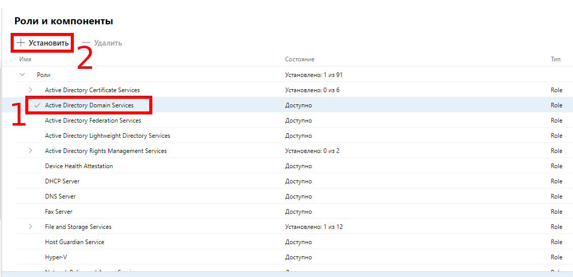 Поставьте галочку напротив «Active Directory Domain Services» и нажмите кнопку «Установить».
