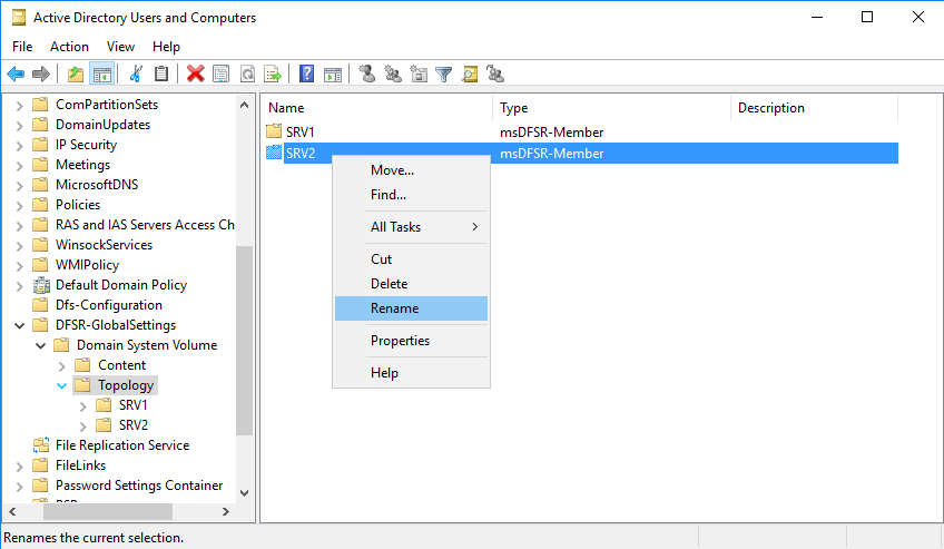 Имя сервера успешно изменено, но это еще не все. После переименования контроллера домена требуется обновить Distributed File System (DFS) или File Replication Service (FRS) Replication member object. Этот объект необходимо обновить с новым именем для того, чтобы контроллер смог реплицировать папку SYSVOL.
