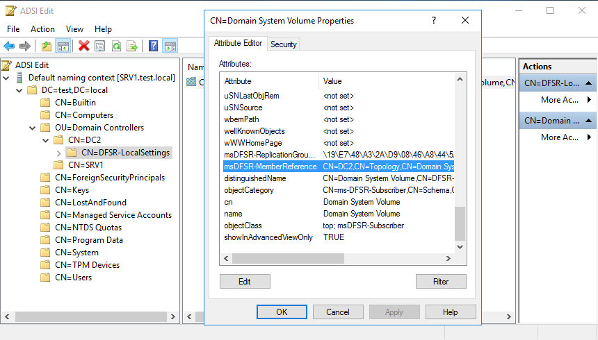 Для проверки можно снова воспользоваться ADSIEdit. Надо найти объект DFSR-LocalSettings и убедиться в том, что у него в атрибуте msDFSR-MemberReference указано новое имя сервера.