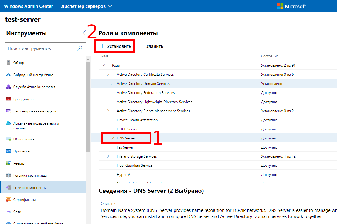 Опять переходим на компьютер с Windows Admin Center для того, чтобы установить роль «DNS Server». На самом деле, «Active Directory Domain Services», «DNS Server» и любые другие роли и компоненты можно было установить за один раз, просто выбрав несколько галочек.