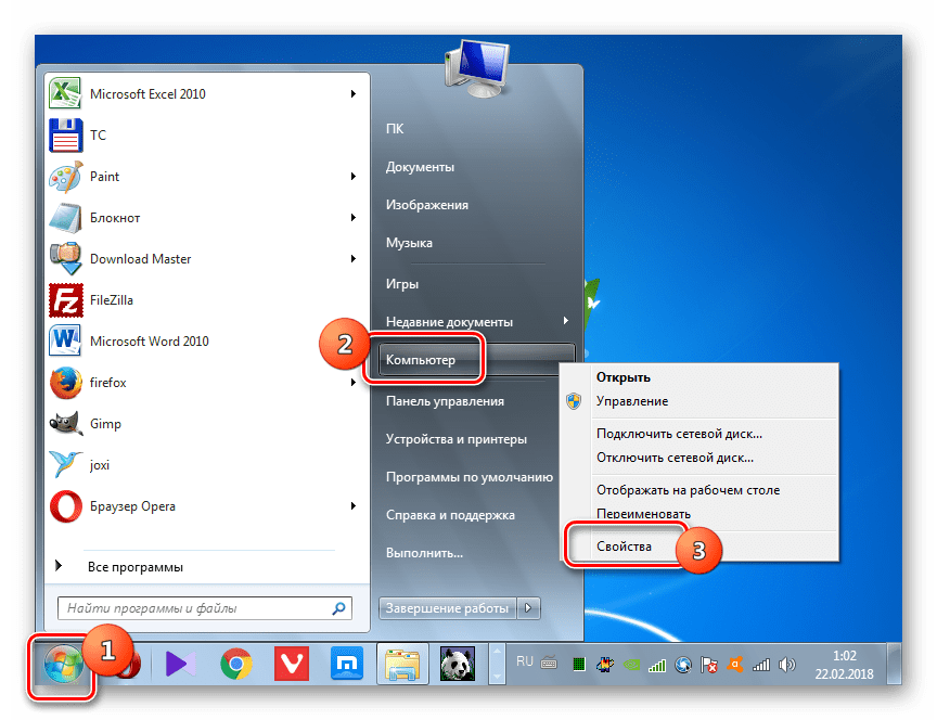 - Жмите «Пуск». Щелкните правой кнопкой мышки (ПКМ) на появившейся панели по наименованию «Компьютер». В отобразившемся перечне выберите «Свойства».