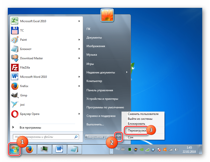 Далее, как и в предыдущем способе, для полного завершения задачи нам требуется перезагрузить ПК. Теперь придется сделать это вручную. Жмите «Пуск» и щелкайте по треугольной иконке справа от надписи «Завершение работы». Выберите из списка, который отобразится, вариант «Перезагрузка».