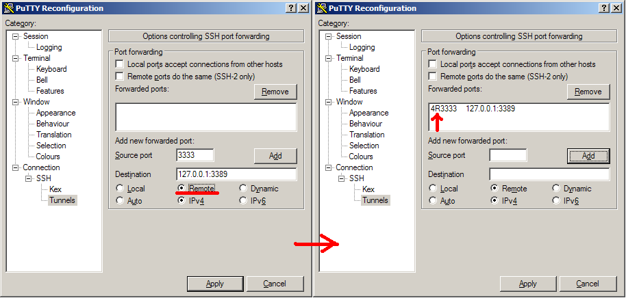 Здесь уже у нас есть возможность подключаться через SSH напрямую к 212.212.212.212 благодаря наличию NAT–а. А вот 212.212.212.212 подключиться на 192.168.0.2 без специальных ухищрений, понятное дело, не сможет, т.к. 192.168.0.2 не подключён к Интернет непосредственно. Предположим, что пользователю, сидящему под X–ами на 212.212.212.212 нужно через remote desktop попасть на наш компьютер 192.168.0.2. Для этого в SSH–сеансе подключения с 192.168.0.2 на 212.212.212.212 нужно изменить настройки в разделе Tunnels следующим образом: