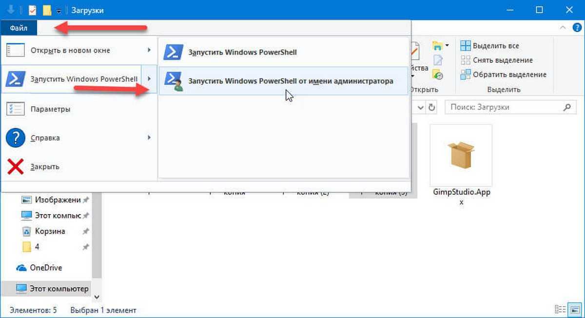 - В проводнике перейдите в папку с пакетами, из меню Файл запустите PowerShell и выполните: