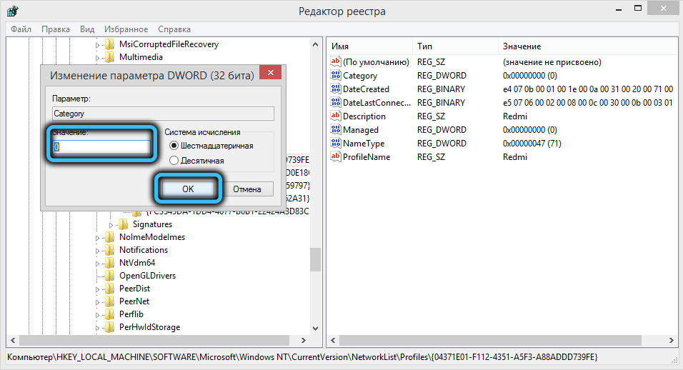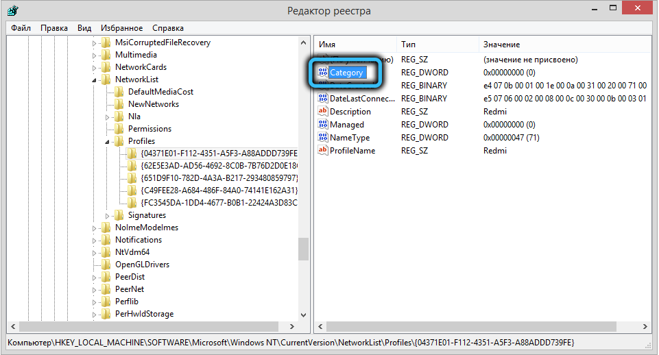 Ищем своё, кликаем по нему, а в правом окне щёлкаем мышкой по параметру Category, чтобы поменять единичку на нолик. Значение 0 как раз и соответствует общедоступной сети.