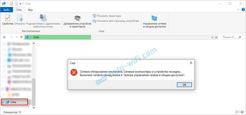 Можно сразу перейти в проводник, на вкладку «Сеть». Если сетевое обнаружение на этом компьютере отключено, то вы увидите сообщение: «Сетевое обнаружение отключено. Сетевые компьютеры и устройства не видны».