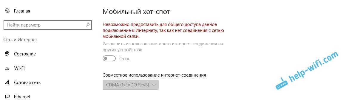 Ошибка «Невозможно предоставить для общего доступа данное подключение к интернету, так как нет соединения с сетью мобильной связи».