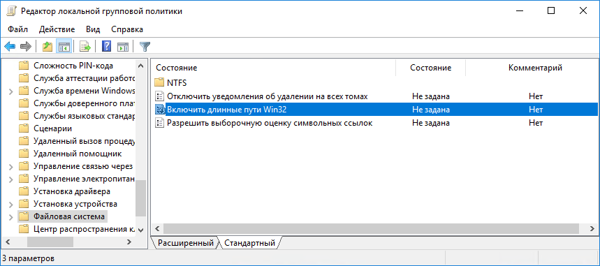 Или через групповые политики (Win+R\gpedit.msc) Computer Configuration > Administrative Templates > System > Filesystem > Enable NTFS long paths.Оно же в локализованном варианте: Конфигурация компьютера > Административные шаблоны > Система > Файловая система > Включить длинные пути Win32.