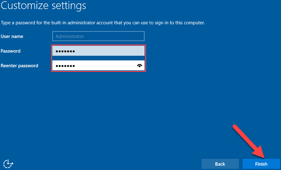 По умолчанию имя пользователя — «Administrator», придумайте ему сложный пароль (пароль, состоящий из строчных букв, прописных букв, цифр и символов). Повторно введите пароль. Затем нажмите кнопку «Finish». Используя эти имя пользователя и пароль, вы можете авторизоваться на сервере.