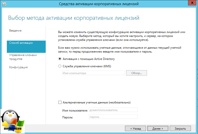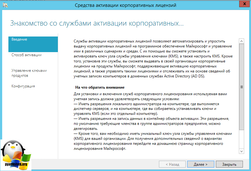 На первом окне вы увидите знакомство со службой активации корпоративных лицензий, жмем сразу далее.