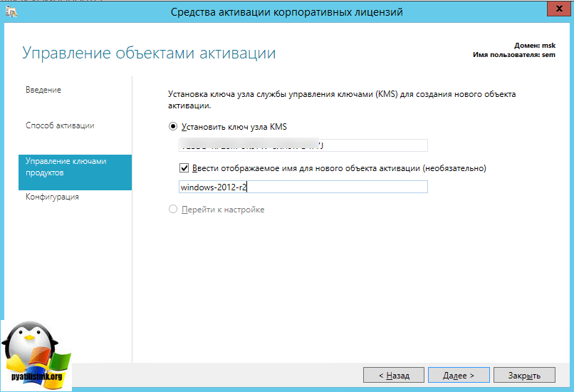 Далее вы указываете ваш KMS ключ (серверный). (для KMS и ADBA используется один и тот же ключ), его имя (позволяет в дальнейшем более удобно работать со множеством ключей), так как я в своем примере хочу активировать через KMS сервер Windows Server 2012 R2, то и подписываю отображаемое имя, соответственно.